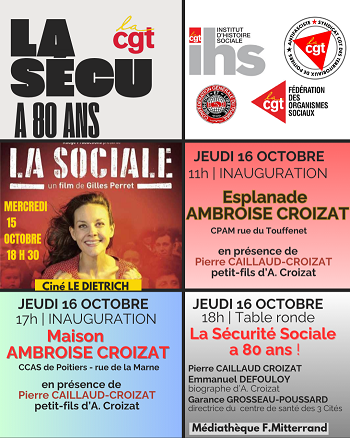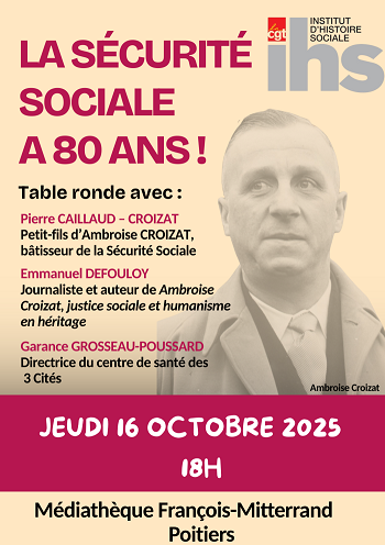 Le 16 octobre, l'Institut d'Histoire Sociale de la CGT86 organise une conférence sur la Sécurité Sociale avec le petit-fils d'Ambroise Croizat à la Médiathèque de Poitiers de 17 à 20 heures.